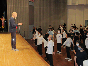 | 後半の実技は、甩手を行いました。講義での学びを活かし、自分の背骨に触れて第3腰椎の場所を確認 した後、腰の軸の安定、股関節や肩甲骨の動き、「平目平視」「眼随手転」など目線にまで意識を向けて 行うことができました。 楊進理事長の「太極拳は80、90歳代から解かる!」とのお言葉に、あせらず、おこたらず、稽古を重 ねて体得していく楽しみができました。 |